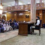 (Picture: Zabihullah Mujahid, Taliban spokesperson, talks with journalists in Kabul. Credit: EPA)
