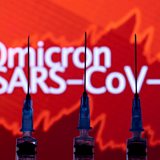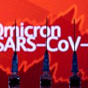 (Picture shows syringes with needles in front of the words "Omicron SARS-CoV-2")