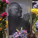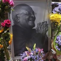 (Picture shows Floral tributes alongside a smiling picture of Archbishop Desmond Tutu. Credit: EPA)
