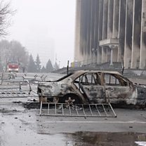 (Photo: A burnt car following the protests triggered by fuel price increase outside the city administration headquarters in Almaty, Kazakhstan. Credit: Reuters)