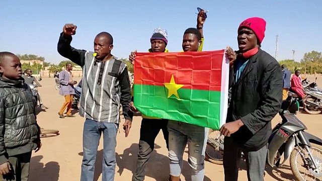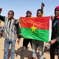 (Photo: People hold a Burkina Faso flag as hundreds gather in downtown Ouagadougou to show support for the military. Credit: Reuters).
