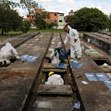 (Photo: Gravediggers wearing protective suits handle bags of bones during exhumations to open space on cement graves as new burials are suspended, except private deposits and children, at Vila Nova Cachoeirinha cemetery amid the outbreak of the coronavirus disease in Sao Paulo, Brazil on April 1, 2021. Credit: Amanda Perobelli/File Photo/Reuters)