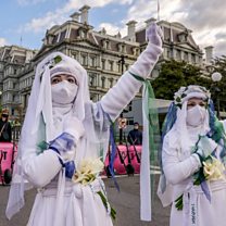 (Photo: The White Rebels and Extinction Rebellion DC block 17th Street after dumping cow manure outside the White House on Earth Day to protest U.S. President Joe Biden"s climate plan in Washington, U.S., April 22, 2021. Credit: Evelyn Hockstein/Reuters)