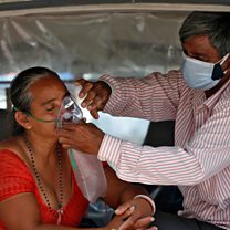 Picture: The husband of Nanduba Chavda adjusts his wife's oxygen mask as they wait in a car to enter a COVID-19 hospital for treatment in Ahmedabad (Reuters / Amit Dave)