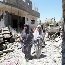 (Photo: Palestinian women walk at the site of destroyed houses in the aftermath of Israeli air and artillery strikes as cross-border violence between the Israeli military and Palestinian militants continues, in the northern Gaza Strip May 14, 2021. Credit: Mohammed Salem/Reuters)