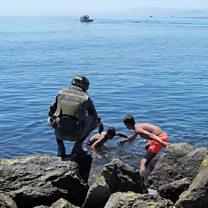 (Photo: A boy resident in Cauta and a Spanish soldier help a migrant near the fence between the Spanish-Moroccan border, after thousands of migrants swam across the border, in Ceuta, Spain, May 19, 2021.