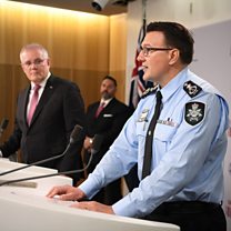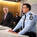 (Photo: Commissioner Reece Kershaw (R) and Australian Prime Minister Scott Morrison (L) attend a press conference in Sydney, Australia, 08 June 2021. Credit: DEAN LEWINS AUSTRALIA AND NEW ZEALAND OUT/EPA)