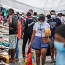 (Photo: This picture taken on April 24, 2021 shows residents wearing face masks walking through the fish market in the Fijian capital Suva ahead of an expected lockdown in the capital due to a Covid-19 spike. Credit: Leon LORD / AFP via Getty Images)