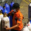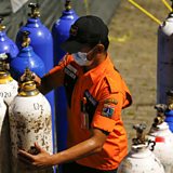 Picture: A disaster management officer prepares an oxygen tank to distribute to hospitals in Jakarta, as Indonesia deals with an oxygen shortage during a surge in Covid-19 cases (Reuters / Willy Kurniawan)