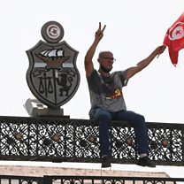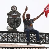 (Photo: A protester sits on top of a gate outside the parliament building in the capital Tunis, Tunisia. Credit: EPA/STR)