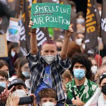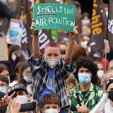 (Photo: A protester holds cardboard reading "smells like air pollution" during the Fridays For Future global climate action day in Berlin, German. Credit: EPA/Clemens Bilan)
