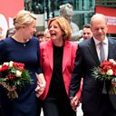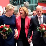 (Photo: Social Democratic Party (SPD) top candidate for chancellor Olaf Scholz and SPD member Franziska Giffey carry flower bouquets as they walk with Rhineland-Palatinate State Premier Malu Dreyer at their party leadership meeting, one day after the general elections, in Berlin, Germany, September 27, 2021. Credit: Hannibal Hanschke/Reuters)