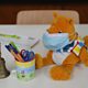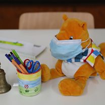 (Photo: A stuffed toy wearing a face mask in an improvised classroom prepared for a primary school class in a recreation hall on February 20, 2021 in Wessling, Germany. Credit: Alexandra Beier/Getty Images)