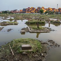 (Photo: A view of public cemetery which submerged by flood waters from rising sea levels on July 18, 2020 in North Jakarta, Indonesia. Since the 1970s, parts of Jakarta have sunk more than four metres, at a rate of up to 25 centimetres a year. Credit: Afriadi Hikmal/NurPhoto via Getty Images)