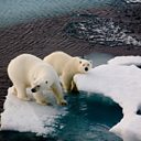 (Photo: Two polar bears on a small ice floe surrounded by water. Symbolic for climate situation in the arctic. Credit: SeppFriedhuber/Getty Creative)