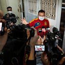 (Photo: Deputy assignment editor Ronson Chan (C) of the online media outlet Stand News speaks to members of the press outside the media outlet office after taken for questioning by the police in Hong Kong, China, 29 December 2021. Credit: MIGUEL CANDELA/EPA)