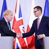 Picture: British Prime Minister Boris Johnson and Polish Prime Minister Mateusz Morawiecki shake hands during a joint press conference