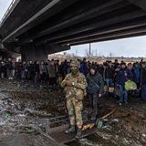 (Photo: A Ukrainian military member stands guard as residents wait to cross the destroyed bridge as they flee from the frontline town of Irpin, Kyiv region, Ukraine, 07 March 2022. Credit: European Pressphoto Agency)