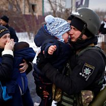 (Photo: A Police officer says goodbye to his son as his family flees from advancing Russian troops as Russia's attack on Ukraine continues in the town of Irpin outside Kyiv, Ukraine, March 8, 2022. Credit: Thomas Peter/Reuters)