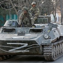 (Photo: Service members of pro-Russian troops in an armoured vehicle with the symbols "Z" painted on its sides. Credit: Reuters/Alexander Ermochenko)