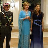 (Picture: King Abdullah and his wife Queen Rania (pictured far right) attend the wedding ceremony of Prince Hamzah and Princess Noor (left) alongside Hamzah's mother Queen Noor (centre). Credit: Getty Images)