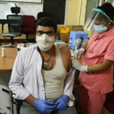 (Photo: An Indian man receives a dose of a vaccine against COVID-19, during a vaccination campaign at KC General Hospital in Bangalore, India. Credit: EPA/JAGADEESH NV)