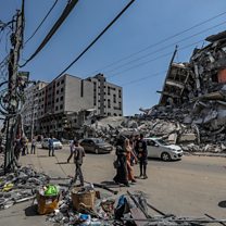 (Photo: Palestinians walk in Al-Remal market street next to the destroyed Al-Shorouq tower after a ceasefire between Israel and Gaza fighters. Credit: Mohammed Saber/EPA)