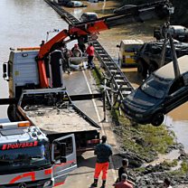 (Image: Rescue services clear wrecked cars and trucks from a federal highway in Erftstadt, Germany. Credit: EPA)