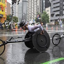 (Image: Manuela Schaer of Switzerland in action during the Marathon T54 at the 2020 Tokyo Summer Paralympics Games at the Olympic Stadium in Tokyo. Credit: EPA)