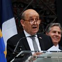 (Photo: French Foreign Minister Jean-Yves Le Drian delivers remarks at the unveiling of a model of the Statue of Liberty at the French Ambassador's residence in Washington, 14 July 2021. Credit: Reuters/Evelyn Hockstein)