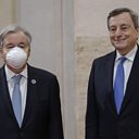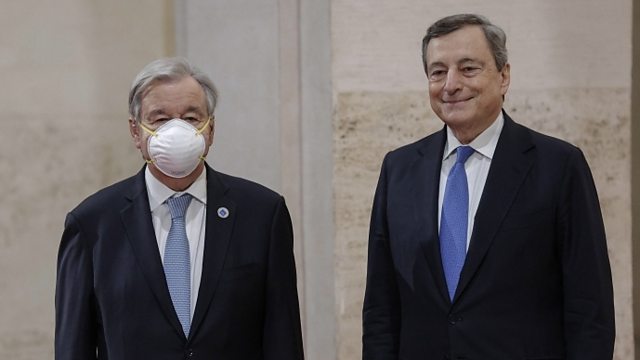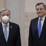 (Photo: Italian Premier Mario Draghi (R) with UN Secretary General Antonio Guterres (L) during their meeting at Palazzo Chigi in Rome, Italy, 29 October 2021, ahead of an upcoming G20 summit of world leaders to discuss climate change, covid-19 and the post-pandemic global recovery. EPA/GIUSEPPE LAMI / POOL)