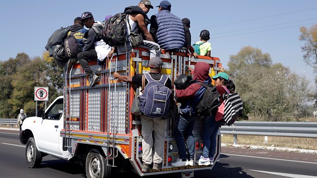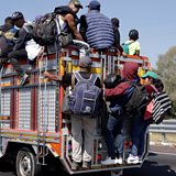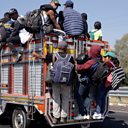 (Image: A group of migrants board a truck on the Puebla-Mexico highway. Credit: EPA/Hilda Rios)