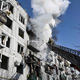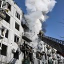 Photo: Firefighters work on a fire on a building after bombings on the eastern Ukraine town of Chuguiv on February 24, 2022 Credit: Getty Images
