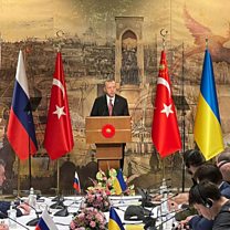 (Photo: Turkish President Erdogan addressing the Russian and Ukrainian delegations in Istanbul, Turkey. Credit: EPA).