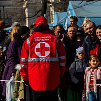 (Photo shows a member of the red cross helping to organise refugees from Mariupol. Credit:Ty O'Neil/SOPA Images/LightRocket via Getty Images)