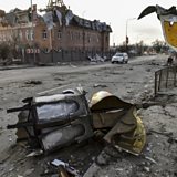 (Picture: Parts of destroyed church lay on the road in the small city of Hostomel. Credit: EPA / Petrashyuk)