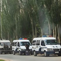 (Photo: Armed police officers stand guard in a street in Kashgar, Xinjiang, 4 May, 2021. Credit: Thomas Peter/Reuters)