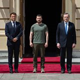 (Photo: L-R, German Chancellor Olaf Scholz, France's President Emmanuel Macron, Ukrainian President Volodymyr Zelensky, Italian Prime Minister Mario Draghi and Romanian President Klaus Iohannis in Kyiv, Ukraine, 16 June, 2022. Credit: Getty Images)