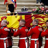 (Photo: Pall bearers carry the coffin of the late Queen, with the Imperial State Crown resting on top to St. George’s Chapel in Windsor. Credit: Reuters)