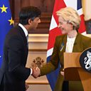 (Photo: Britain's Prime Minister Rishi Sunak and European Commission President Ursula von der Leyen shake hands at the end of a news conference on a post-Brexit deal in Windsor, Britain. Credit: CHRIS J RATCLIFFE/POOL/EPA-EFE/REX/Shutterstock)