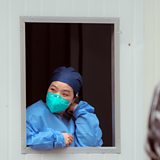 (Photo shows a masked woman stands at the window of a container turned into a Covid-19 fever clinic in Shanghai, China on 1 March 2023. Credit: Alex Plavevski/EPA)