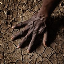 (Photo: A man places his hand on the parched soil in the Greater Upper Nile region of north-eastern South Sudan, Africa 08/04/12. Credit: Julien Behal/PA Wire)