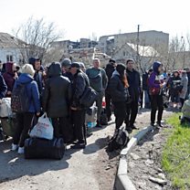 (Photo: Evacuees wait before boarding a bus to leave the Mariupol April 20, 2022. Credit: Reuters/Alexander Ermochenko)