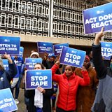(Photo: Protesters carry placards, as more than 80 men suspected of gang raping eight women and carrying out an armed robbery of a television crew appear in court in Krugersdorp, west of Johannesburg, South Africa, August 3, 2022. Credit: REUTERS/Siphiwe Sibeko)