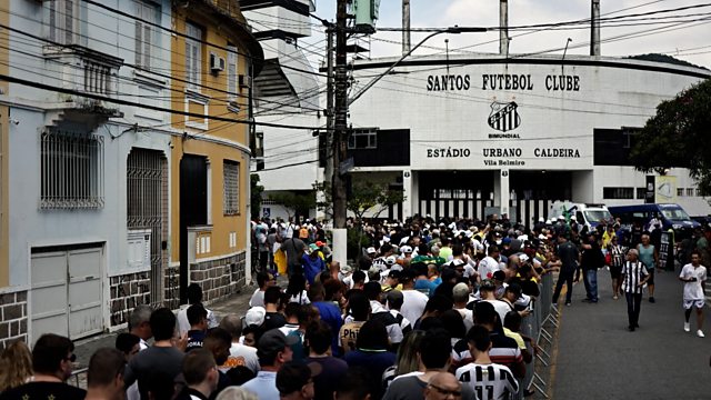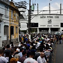 Thousands of people have gathered to pay their respects to Brazil legend Pelé who is lying in state at the ground of his former club Santos. OS's James Reynolds is there speaking to mourners about their memories of the player and to journalists who are there to cover the event.