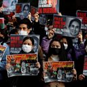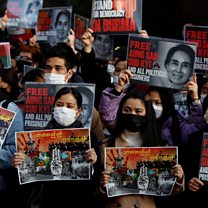 (Photo: Myanmar protesters residing in Japan raise photos of Aung San Suu Kyi during a rally to mark the second anniversary of Myanmar's 2021 military coup, outside the Embassy of Myanmar in Tokyo, Japan February 1, 2023. Credit: Issei Kato/Reuters)