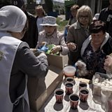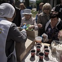 (Image: A woman eats food given to her by volunteers at a food delivery station run by a Hare Krishna group in Kharkiv, Ukraine, Credit: UPI)