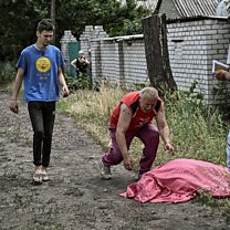 (Image: A man approaches the body of his son who was reportedly killed by a cluster rocket in the Donbas. Credit: ARIS MESSINIS/AFP via Getty Images)