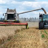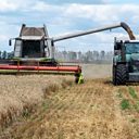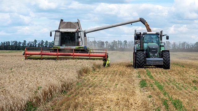 (Image: Farmers harvest a wheat field in the Ukrainian Kharkiv region. Credit: SERGEY BOBOK/AFP via Getty Images)