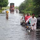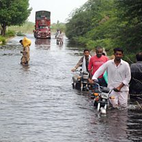 (Image: Pakistani flood victims wade through flood water following flash flood in Mirpur Khas town, in southern Sindh province, Pakistan. Credit: AHMED ALI/Anadolu Agency via Getty Images)